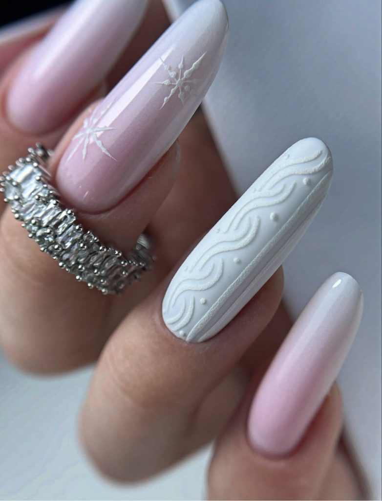 Here, cozy knitwear meets ethereal shimmer. Soft blush tips fade into icy white on elongated nails, with delicate snowflake motifs etched in white and one fully textured nail that mimics a cable-knit sweater. The mix of smooth and raised finishes adds depth without needing extra color, making the whole look feel serene and wintry.