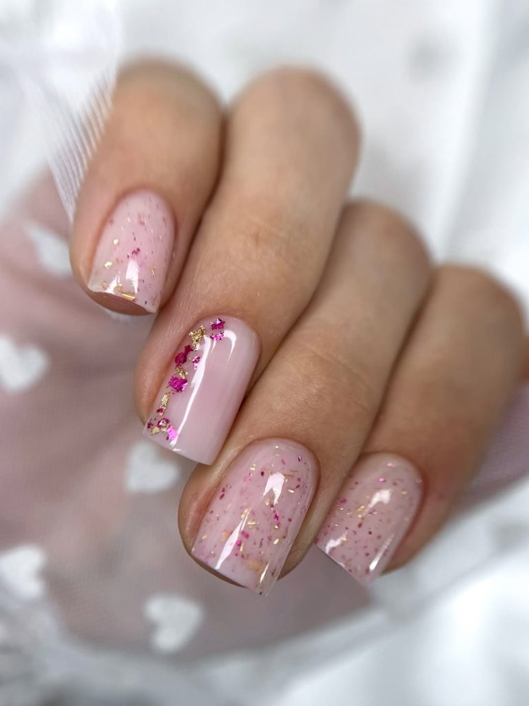 This final look proves that you don’t need length to make a statement. Neat, short, square nails are painted in a translucent blush base, then sprinkled with fine pink and gold shimmer. A few nails feature denser clusters of fuchsia foil and tiny star-shaped pieces near the edges, creating a playful yet delicate sparkle that feels like confetti from a party you’re still thinking about.