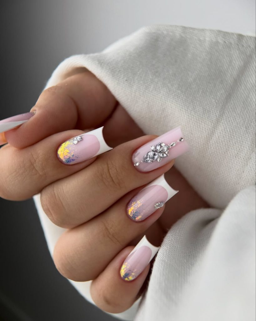 This set takes a classic French and turns the volume up just enough. Neat, mid-length square nails are painted in a milky pink base, finished with crisp white smiles. On a couple of nails, iridescent foil explodes from the cuticle upward, catching gold, lilac, and blue tones depending on the light. One statement nail is dressed with a cluster of clear crystals—like a tiny brooch placed right on the nail—while smaller stones echo the sparkle on neighboring fingers.