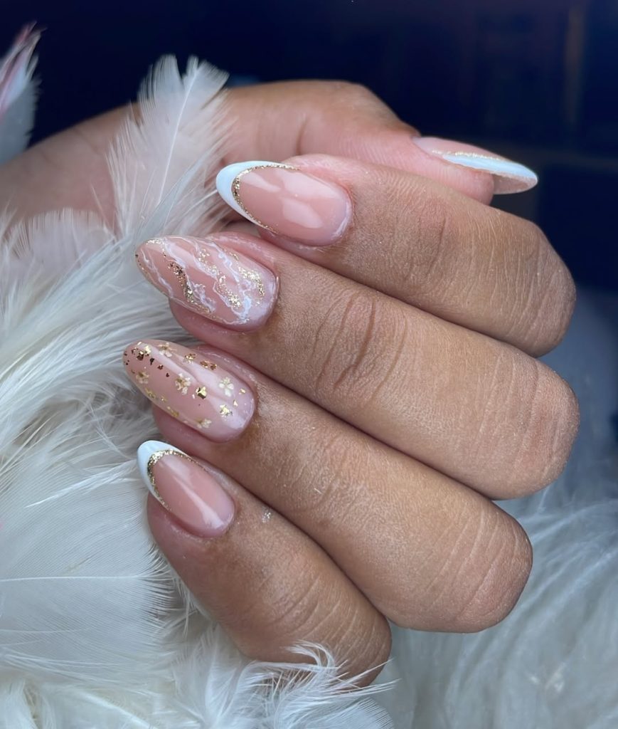 Here, nude Almond nails are dressed up with airy details that feel almost weightless. A glossy, warm neutral base is topped with slim white French tips on some nails, edged in delicate gold. Others feature soft, feathered swirls of white and gold glitter running diagonally across the nail, almost like the reflection of light on water. Tiny flecks of metallic foil scattered through the design add dimension without taking over.