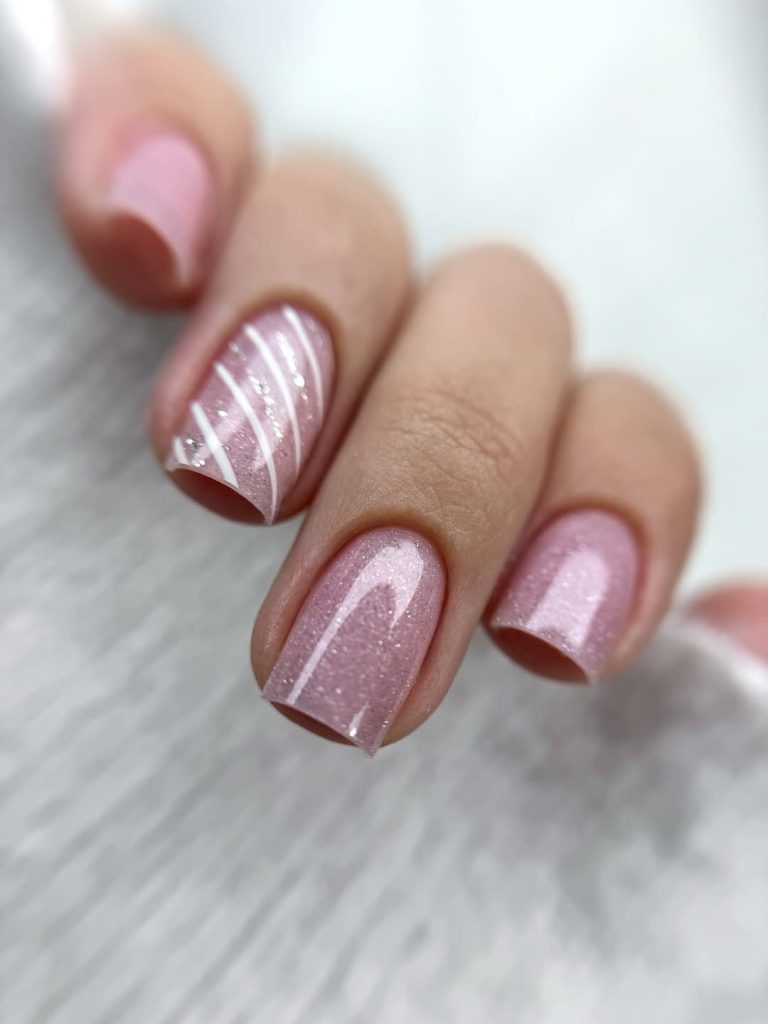 This manicure is soft, sweet, and unexpectedly versatile. Compact short square nails are coated in a fine, sugary pink shimmer that looks almost like sparkling cotton candy. On one accent nail, thin white lines swoop diagonally across the surface, layered with tiny glitter particles to create a candy-cane stripe effect without feeling literal or seasonal.