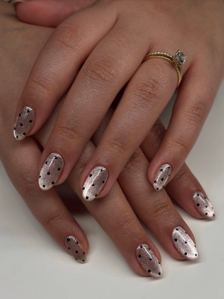 This look is playful and chic all at once. Oval nails are painted with a cool champagne metallic that reflects light like brushed silk. Over-the-top, perfectly spaced black dots are placed on each nail, giving a polka-dot effect that feels modern rather than retro. The contrast between the soft shine and graphic spots keeps the eye moving and makes even the simplest outfit feel styled.