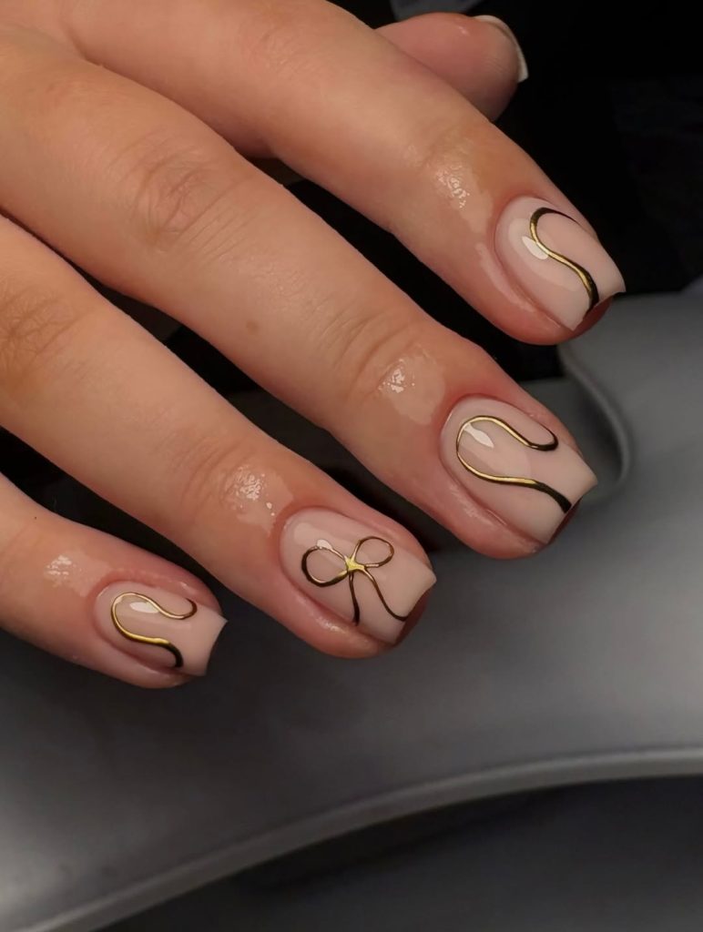 Short, practical nails get a designer treatment here. A sheer nude base keeps the nails clean and glossy, while thin black and gold metal-effect lines meander across each nail in gentle curves. One center nail features the lines tied into a small bow, like a ribbon on a gift. The shapes are simple but considered, turning the set into something that feels like wearable graphic art.
