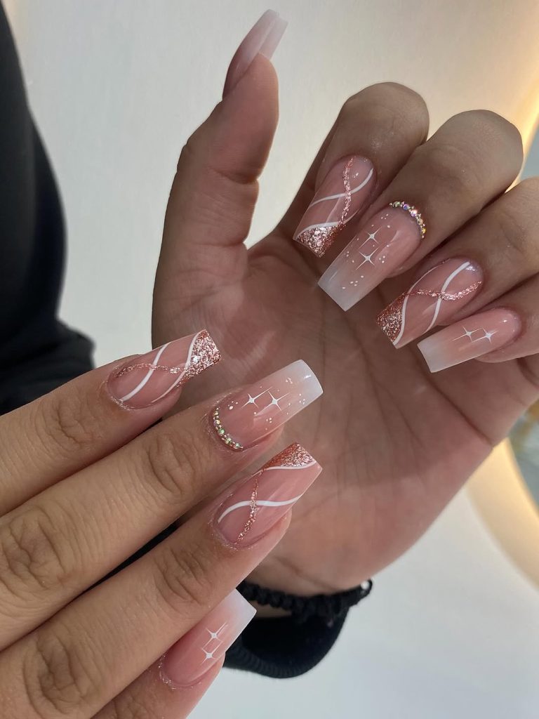 Long square nails are painted in a soft baby-boomer ombré, fading from nude at the cuticle to milky white at the tip. Over this gentle base, rose-gold glitter swoops diagonally in ribbon-like bands, paired with fine white lines and tiny starbursts that look like twinkling lights. A few nails feature a delicate crystal arc at the cuticle, tying the whole composition together.