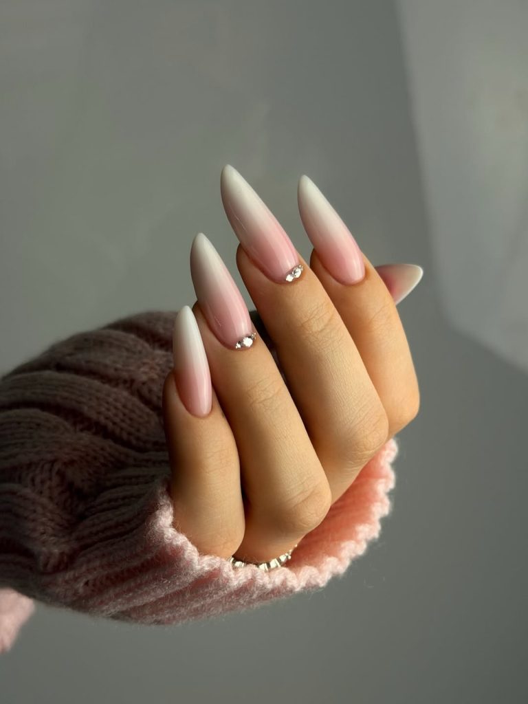 Finally, a set for the minimalist who still loves a hint of sparkle. Long almond nails transition from a sheer blush base to a silky white tip, creating a seamless gradient that lengthens the fingers. At the base of a few nails, tiny silver studs nestle just above the cuticle, like small dewdrops catching the light. The overall feel is quiet, elegant, and incredibly wearable.