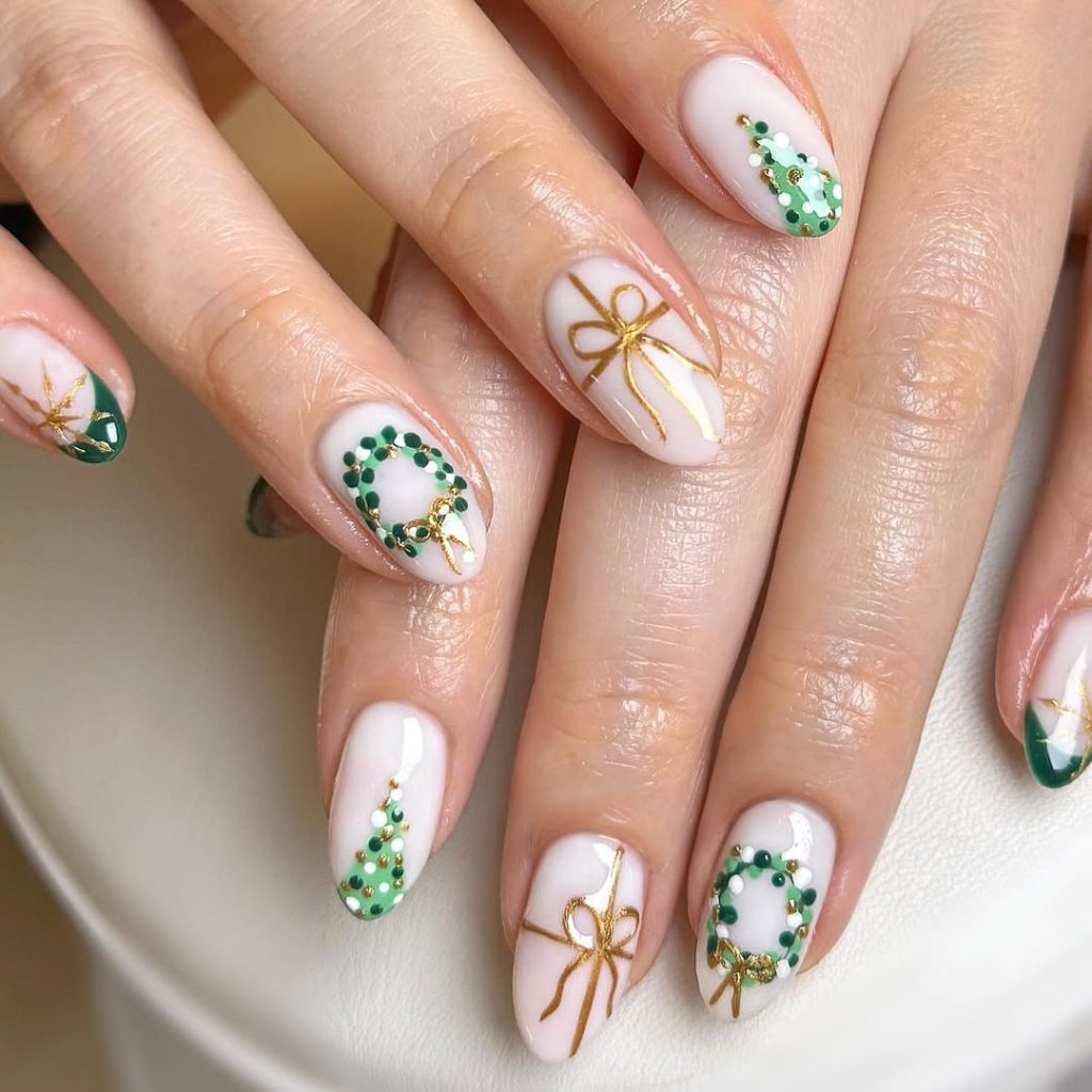 This set feels like a perfectly wrapped present for Christmas 2026. Soft white almond nails become a canvas for tiny emerald wreaths, dotted with raised studs and finished with metallic bows. Other nails are wrapped with slim golden ribbons that curve and cross like luxury gift wrap, giving the whole manicure a polished, editorial aesthetic you’d expect to see on a campaign shot from a high-end department store.