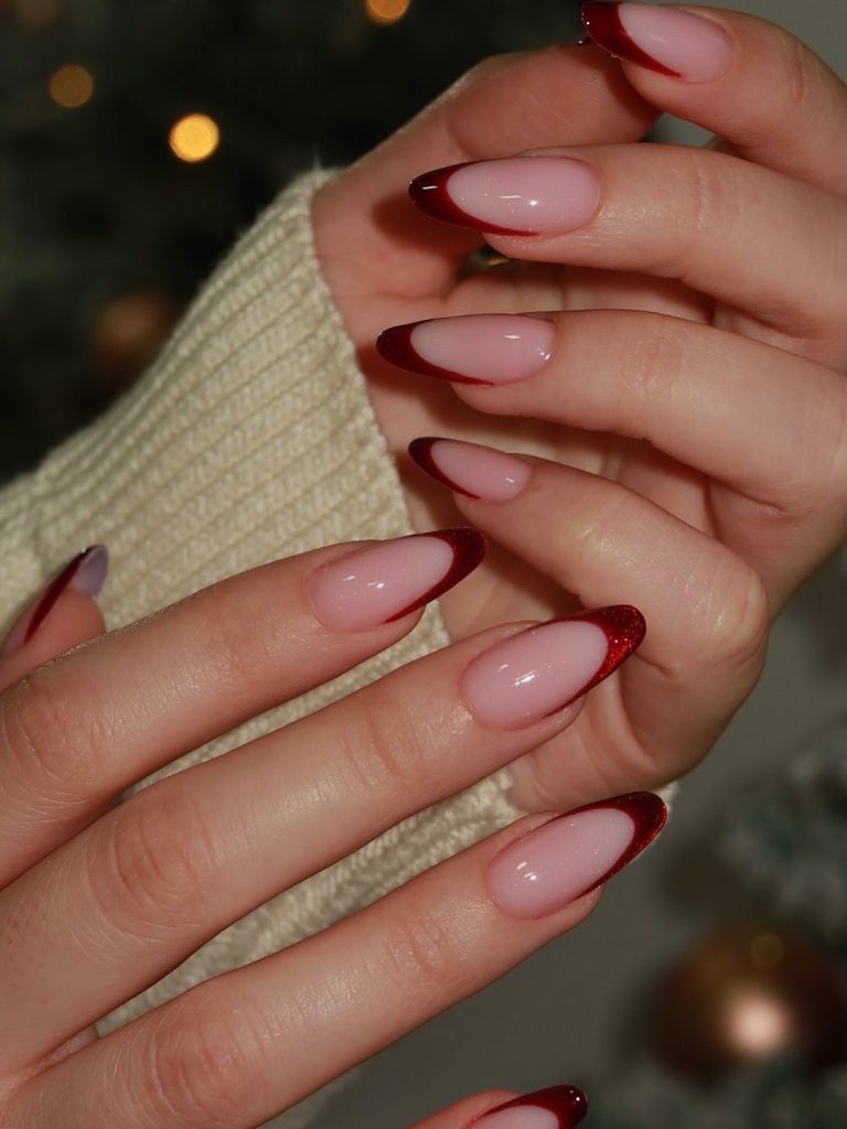 Here, the classic holiday mani gets a sleek update. Long almond nails are painted in a blush pink base, then framed with rich red side-French tips that elongate the nail and add instant drama. A subtle shimmer runs through the color, catching the warm lights in the background and giving the set that softly lit winter glow everyone wants in December selfies.