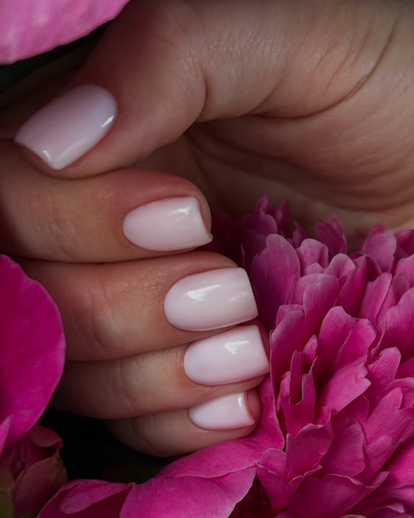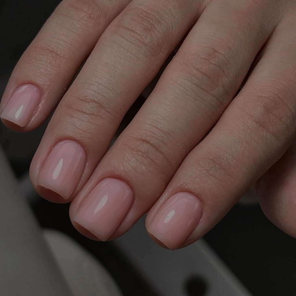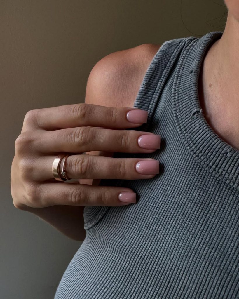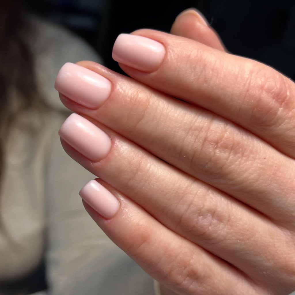 Here, short square nails are painted in a creamy, opaque light pink that leans slightly pinkish nude. The length is practical and comfortable, and the smooth, even finish has just enough shine to feel polished without becoming high-maintenance. It’s one of those shades that instantly brightens the hands and looks like a subtle filter on the skin.