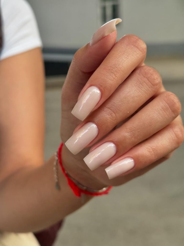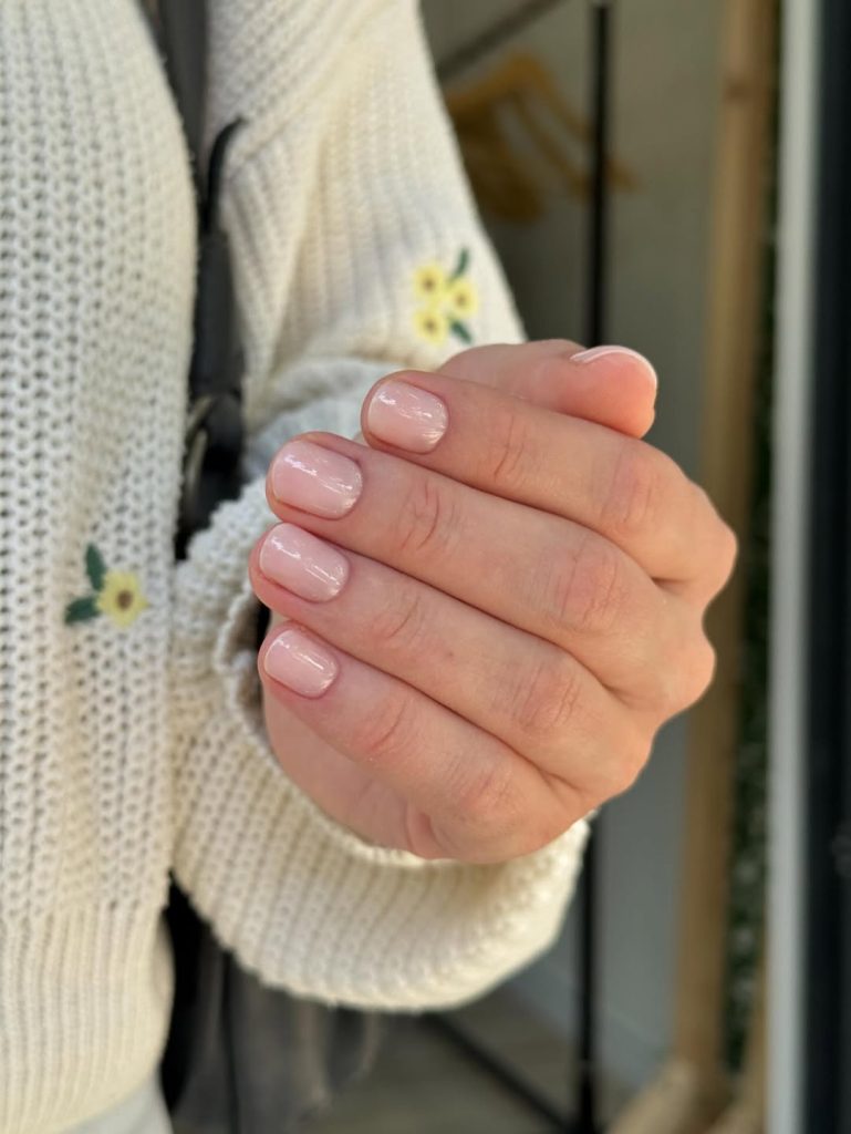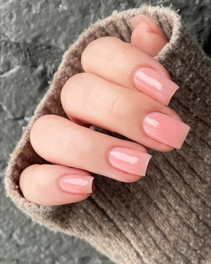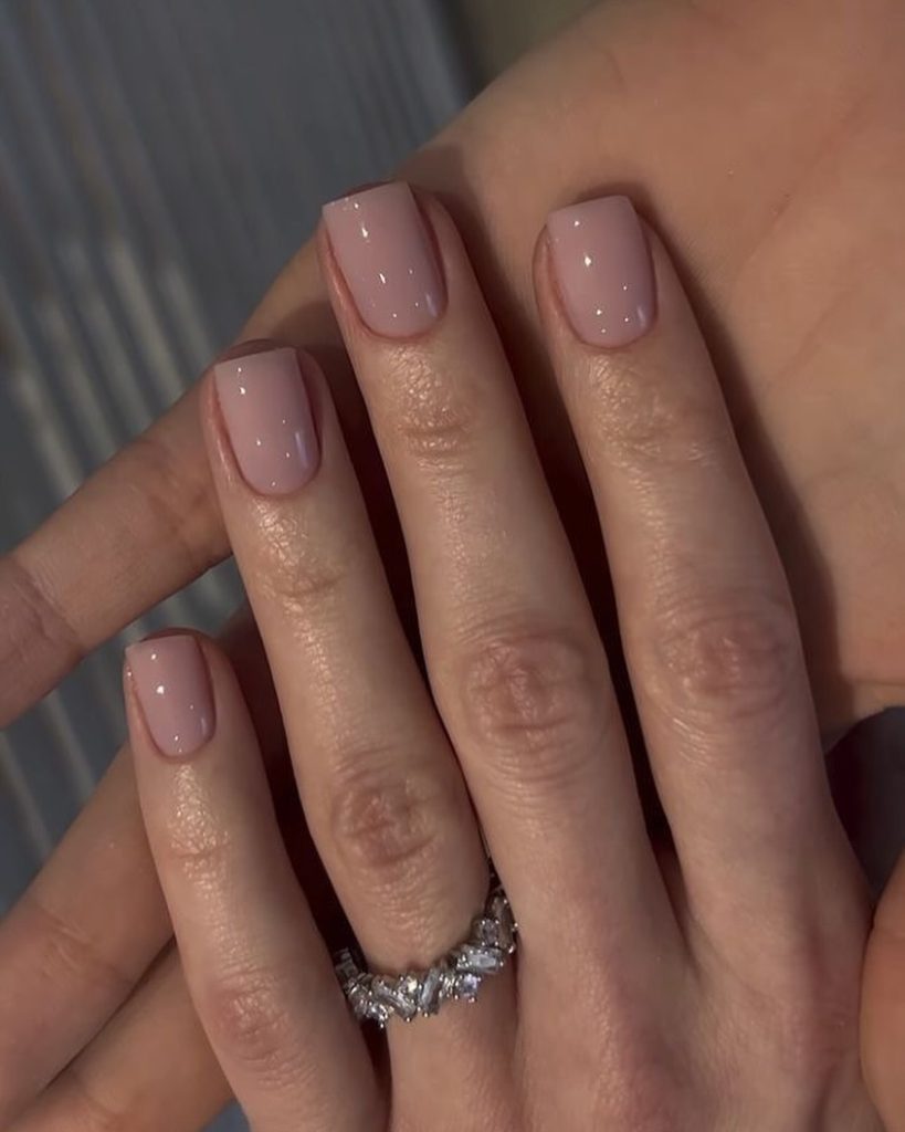 Here, short square nails are painted in a creamy, opaque light pink that leans slightly pinkish nude. The length is practical and comfortable, and the smooth, even finish has just enough shine to feel polished without becoming high-maintenance. It’s one of those shades that instantly brightens the hands and looks like a subtle filter on the skin.
