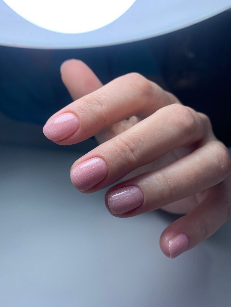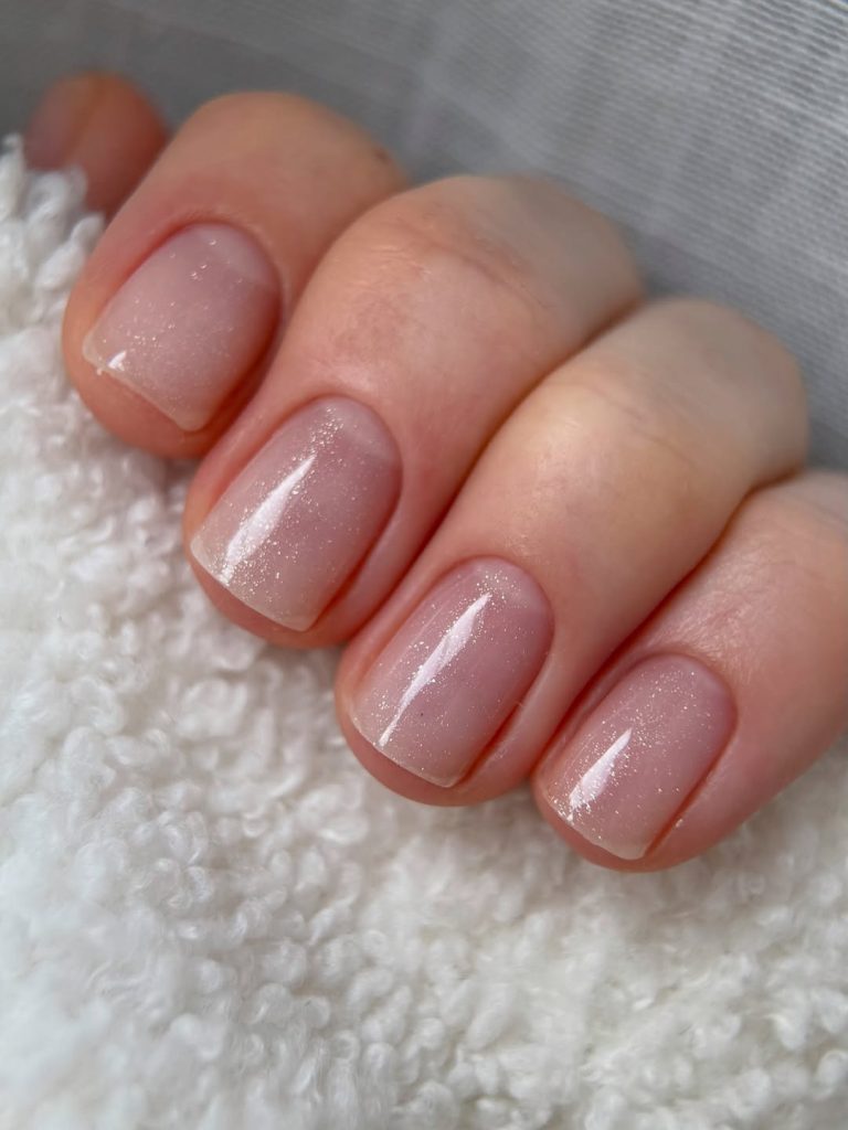 Short, rounded nails coated in a jelly-style light pink nude instantly make the hands look fresh and youthful. The polish has a barely-there shimmer—think ultra-fine glitter dusted on top—so when the light from a lamp hits, each fingertip glows softly. The length is practical for typing, cooking, or buckling kids into car seats, yet the shine keeps it from feeling too casual.