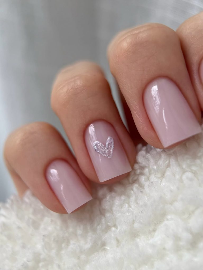 This set keeps the same squared shape and soft nude base but adds a single, sweet accent: a tiny, sparkly heart placed on one nail. The neutral pink background lets that silver motif shine without overwhelming the hand. It’s a perfect example of nail art done thoughtfully—just a little design that tells a story without stealing the entire show.