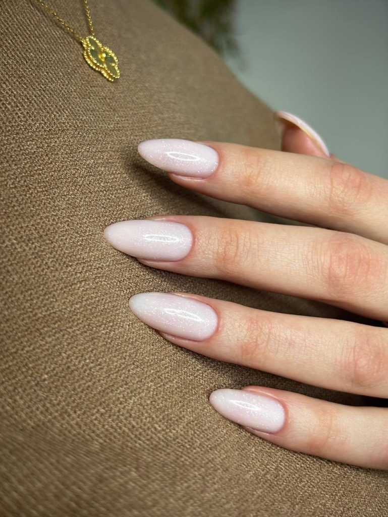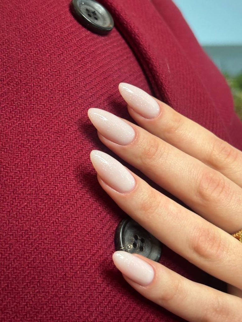 This is a great option if you’re planning outfits around trench coats, soft scarves, and ankle boots. The subtle sparkle echoes jewelry without competing with it, and the elongated shape offers plenty of room for future ideas with design almonds—think micro French tips, negative space, or a delicate line of glitter along the edge when you want more drama. For now, worn simply like this, it channels that “I just stepped out of a fashion editorial” energy while still being practical enough to live your everyday life.