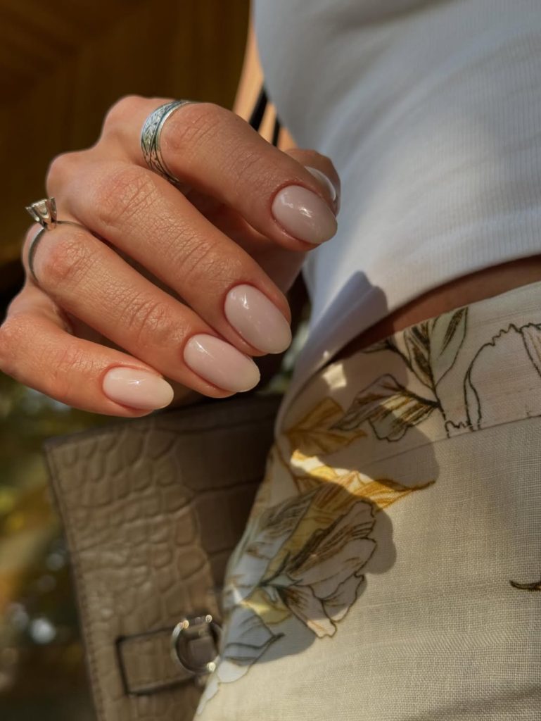 What really makes this style pop is how beautifully it interacts with jewelry and clothing textures. Against a ribbed tank, the glossy nude feels modern and quietly sensual. On the other hand, it frames a rose-gold ring so that the metal and stone take center stage, while the nails act like a soft-focus filter. It’s the kind of manicure that subtly says, “I pay attention to details,” without shouting for attention.