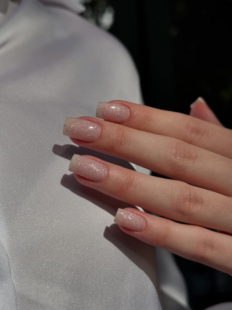 The final design takes nude nails into party territory while keeping them wearable. Long square tips start with a sheer nude base at the cuticle and build up to a soft glitter gradient at the tips. The shimmer is fine and evenly dispersed, so it catches the light without feeling chunky or over the top.