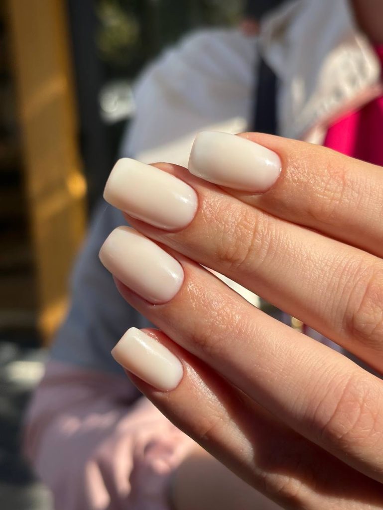 Here, long square nails are painted in a creamy off-white nude that sits right between soft beige and clean white and ivory. The color is fully opaque, which instantly makes the hands look groomed and intentional, and the high gloss reflects the sunlight like polished porcelain. There’s no art or shimmer here, just a perfectly even, minimalist surface that quietly says, “Design classy without trying too hard.”