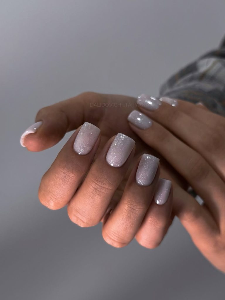 These short square nails play with texture in the most delicate way. A neutral base, somewhere between beige and pale pinkish nude, is laced with ultra-fine glitter that you only notice when the light hits at the right angle. It’s one of those manicures that looks simple from afar but reveals a whisper of magic up close.