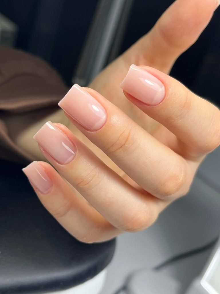 This set plays with subtle depth: short square nails fade from a warmer, pinkish nude near the cuticle into a slightly milky tip, giving a gentle ombre effect without any harsh lines. The finish is ultra-smooth and glossy, making the nails look naturally perfect rather than heavily painted.