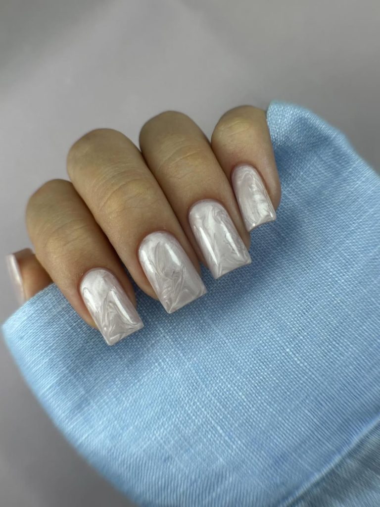 These long square nails are covered in a pearlescent white and nude that looks like crushed shell or satin fabric. Swirled, marble-like strokes run through each nail, creating soft movement without heavy contrast. The glossy finish catches the light in a way that almost mimics chrome, yet the overall effect remains soft and wearable—a true, classy design take on nude nails with nail art that feels elevated rather than busy.