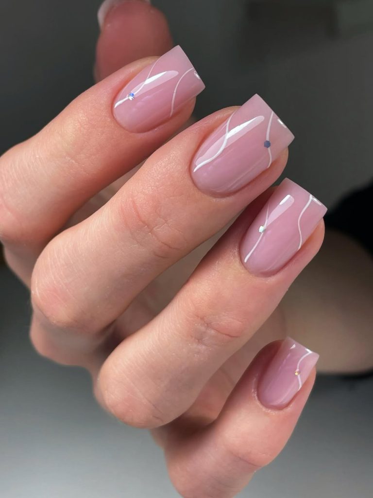 These medium square nails stay within the nude family but add airiness with nail art details: a translucent pink base, delicate white lines that curve across each nail, and a few pinpoint crystals that flash like tiny glitter stars. The composition is light and refined, giving just enough decoration to catch the eye while keeping plenty of negative space so the look still reads neutral.