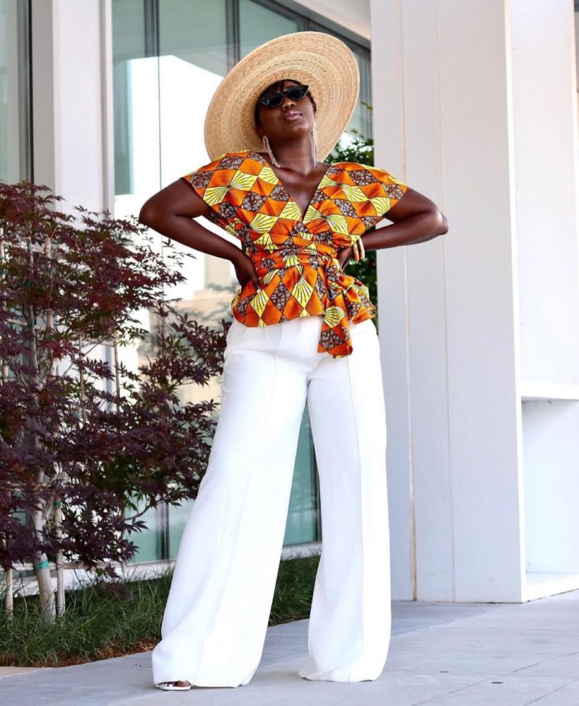 This look feels like vacation, even if you’re just walking into a downtown hotel lobby. Perfect for summer brunch, garden events, or dressy daytime meetups. If your workplace leans creative, swapping the hat for a sleek bun turns the ensemble into a fresh business casual outfit. It’s also a wonderful choice for women over 50 who want color without sacrificing polish; the wide leg balances the bold top beautifully. Keep shoes clean and minimal—strappy sandals or pointed mules—and resist layering on more prints so the Ankara does all the talking.