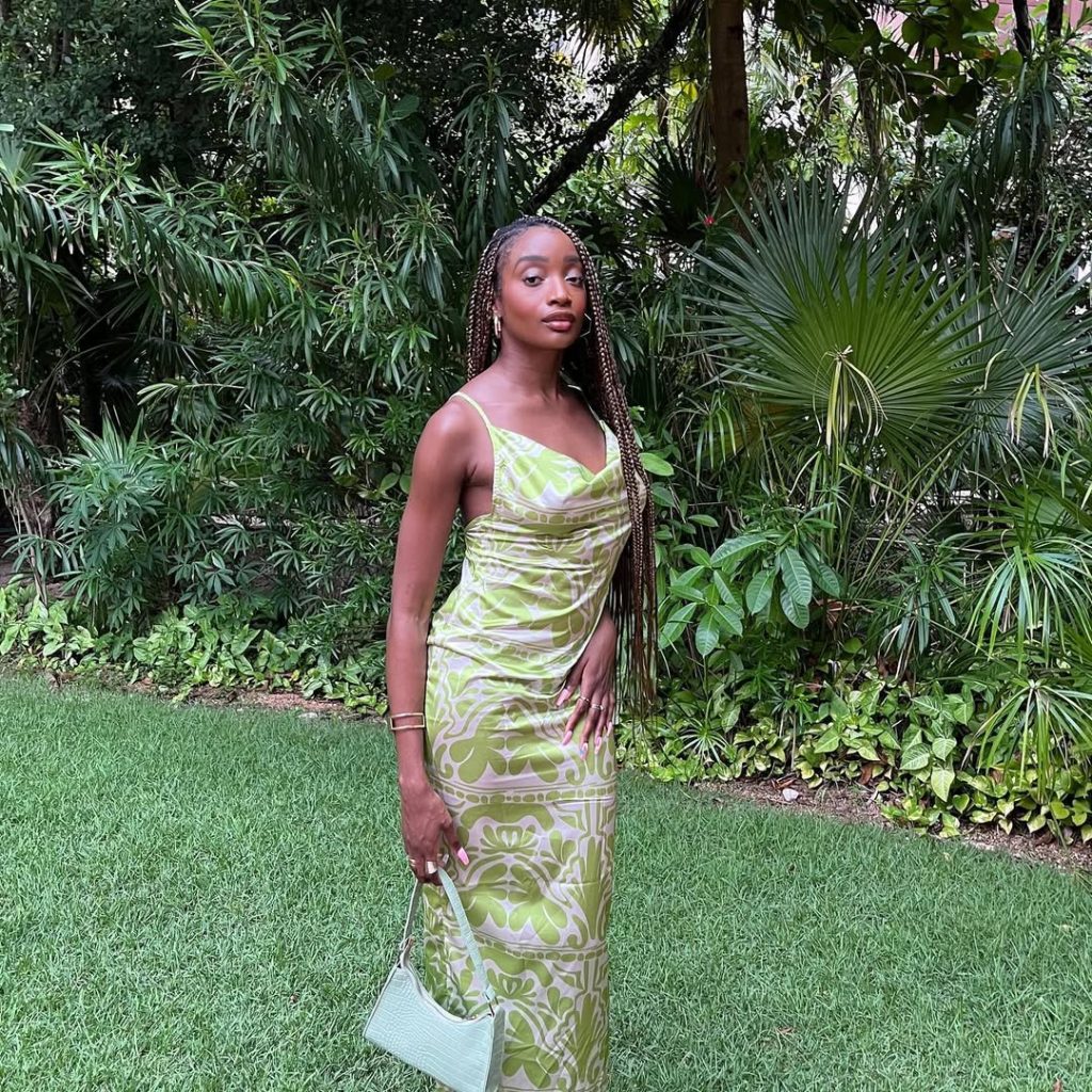 - Sleeveless cowl-neck maxi dress in a green botanical pattern.