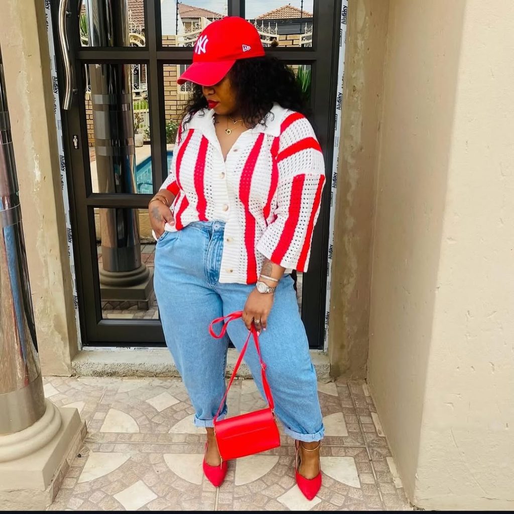 Crochet stripes, boyfriend jeans, and bold red accessories blend sport and polish in an easygoing look that still reads deliberate.
