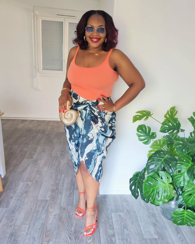 An orange tank and marbled wrap skirt bring resort vibes home, a joyful choice for summer lunches or vacation strolls.