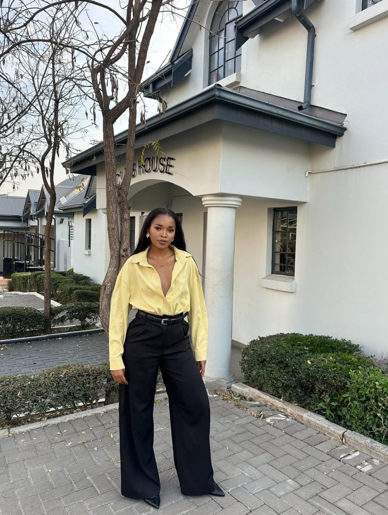 A soft lemon shirt and black wide-leg trousers nail that effortless, powerful business casual energy.