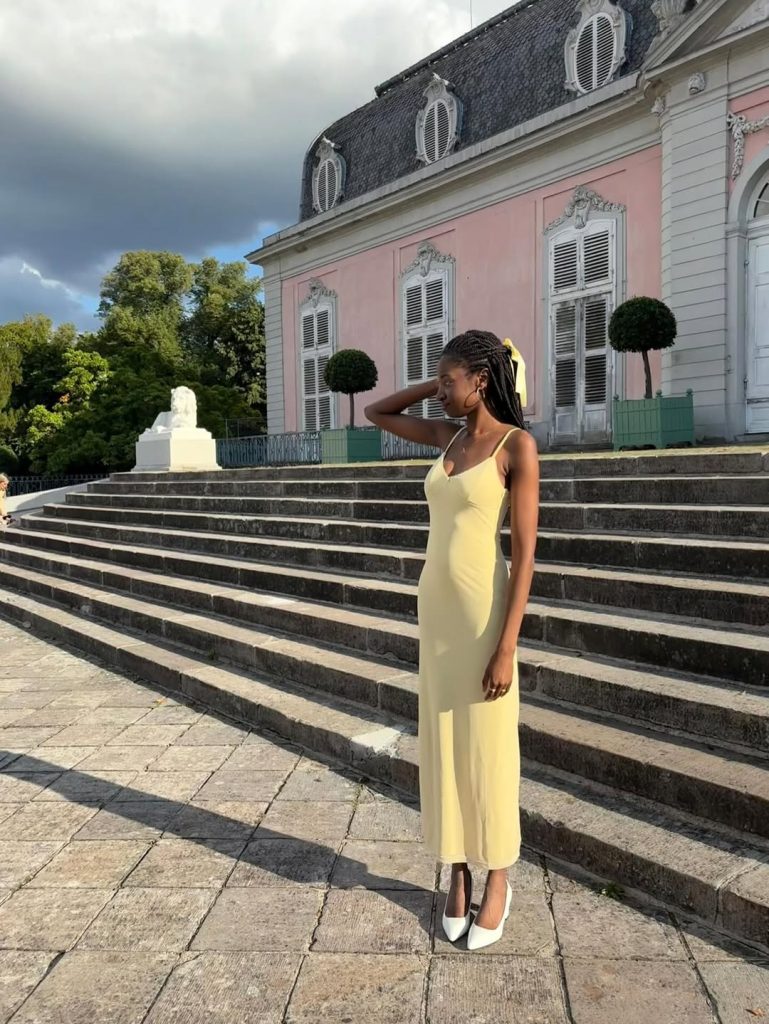 Reach for this when you’re headed to cocktail bars, birthday celebrations, or stylish Halloween nights where you want chic over costume. A long wool coat layered on top makes it viable for chilly fall evenings and mild winter dates. To keep it unmistakably classy, resist overloading jewelry; a single bracelet or ring is enough. This gown is the kind of LBD that proves Black women’s 2026 fashion is all about precision, not excess.