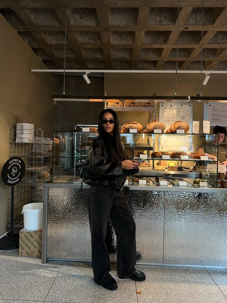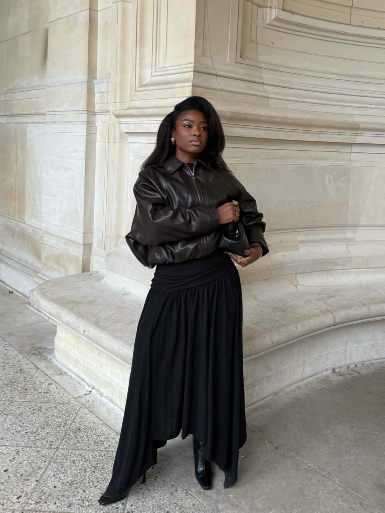 A chocolate leather jacket and draped black skirt create a rich, moody silhouette that feels tailor-made for European fall streets.