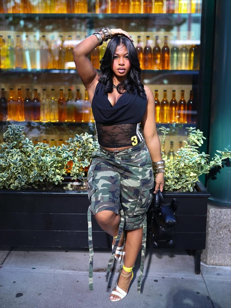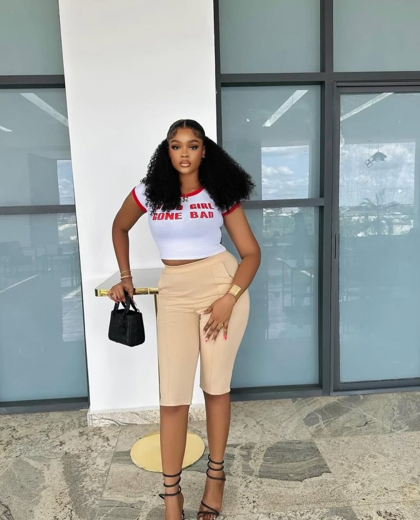 A slogan crop top and sleek beige Bermudas deliver a playful yet polished combo—half sporty casual, half night-out-ready.