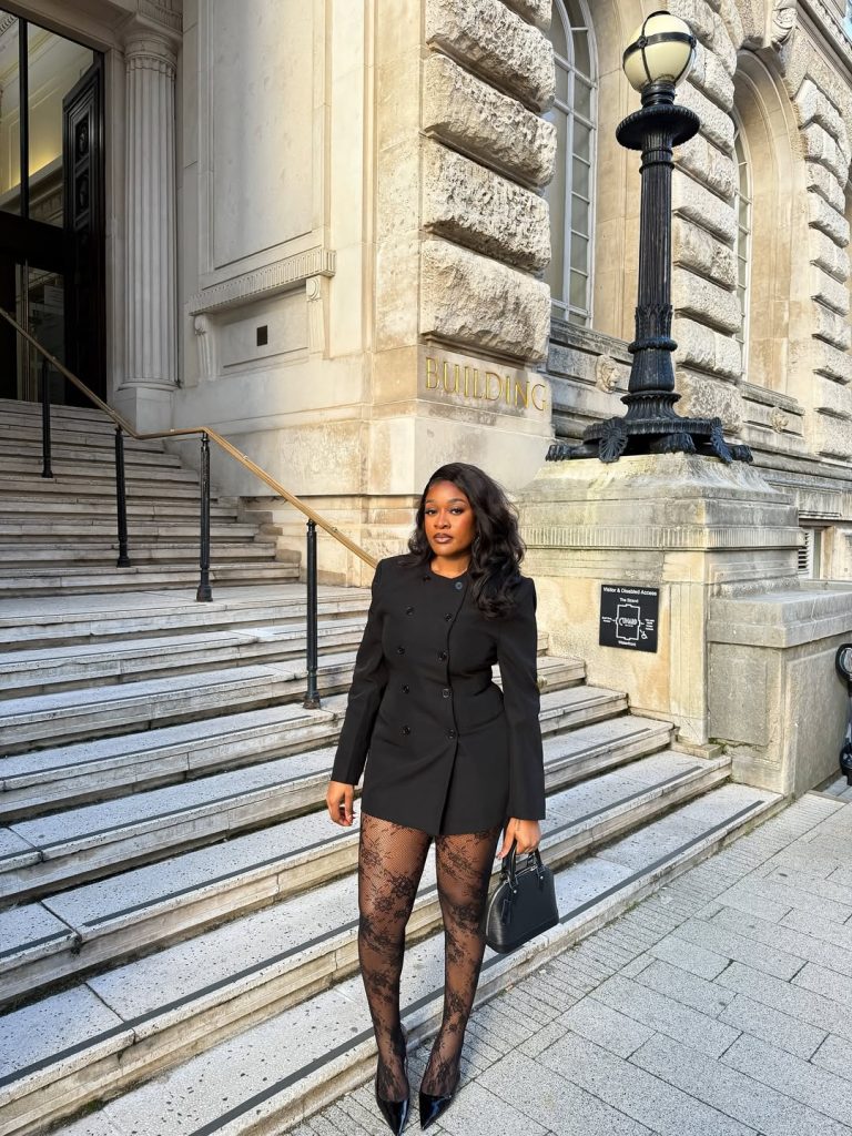 A tailored black blazer dress meets lace tights for a sharp, sensual look that bridges city power dressing and evening party glamour.