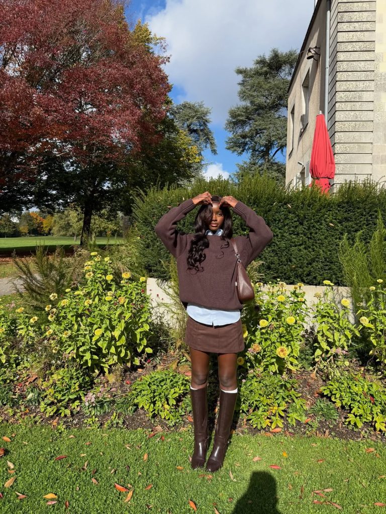 A brown knit mini skirt and knee-high boots form a collegiate-inspired outfit that feels perfectly tuned to crisp fall days.