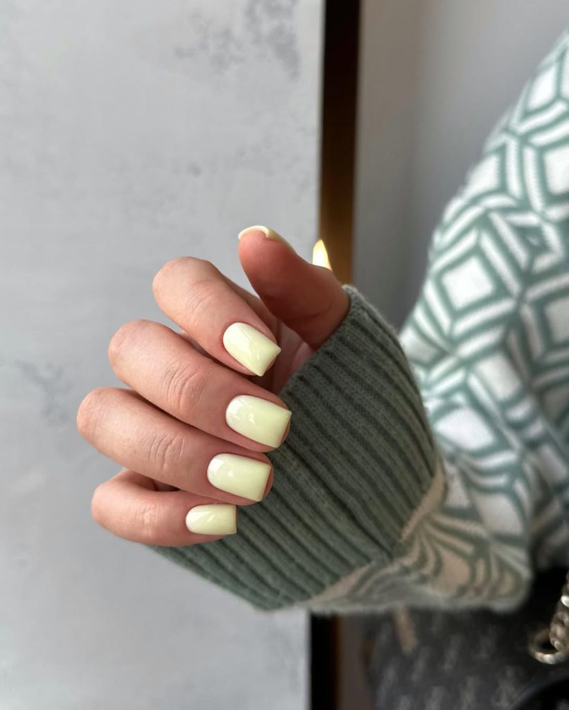 This creamy yellow manicure leans gentle rather than bold, making it a standout option for spring 2026 solid-color nails. The square shape adds structure, while the pastel yellow keeps the look approachable and fresh. It’s a shade that feels optimistic without being loud, especially flattering when paired with cozy textures or minimalist outfits. Yellow like this feels modern, wearable, and surprisingly versatile for everyday spring styling.