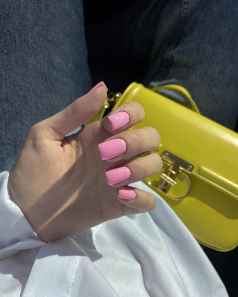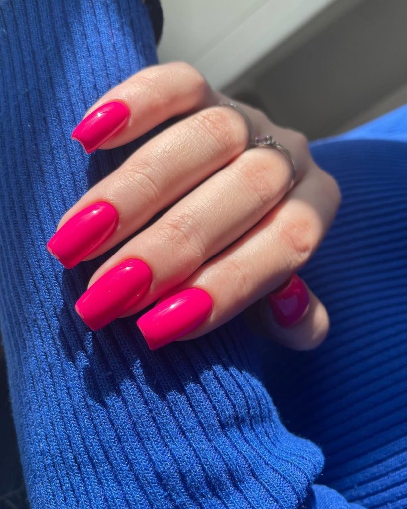This saturated pink shade delivers instant confidence. Bold without needing added design, it reflects the growing demand for expressive solid colors in spring nails in solid color 2026. The square shape keeps the manicure grounded, making it feel wearable even with vibrant color. Styled with monochrome outfits or denim-heavy looks, this manicure becomes a statement accessory in its own right—effortless, modern, and undeniably trendy.