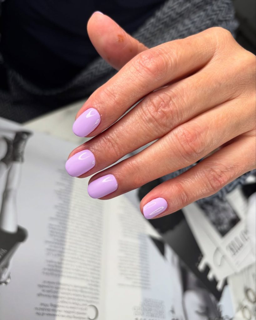 This soft lilac manicure feels effortlessly fresh for spring nails with a solid color in 2026. The short, rounded shape keeps the look practical and modern, while the cool pastel tone adds a subtle seasonal lift. Lilac works beautifully with light knits, denim, and neutral spring layers, making it an ideal everyday shade. It’s a color that feels calm rather than trendy-driven, perfect for women who want a polished manicure that still reflects the lighter mood of spring.