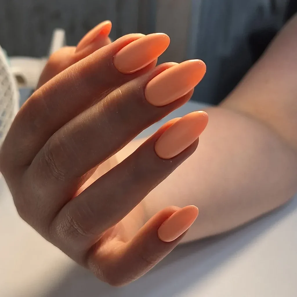 Peach tones continue to gain momentum in 2026, and this version feels especially flattering thanks to its soft warmth. The almond shape elongates the fingers, while the creamy peach polish reflects light beautifully, giving the nails a healthy, glossy appearance. This shade pairs effortlessly with beige, white, and soft brown wardrobes. It’s understated, classy, and perfect for the woman who wants an almost-nude shade that falls closer to bright than pale.