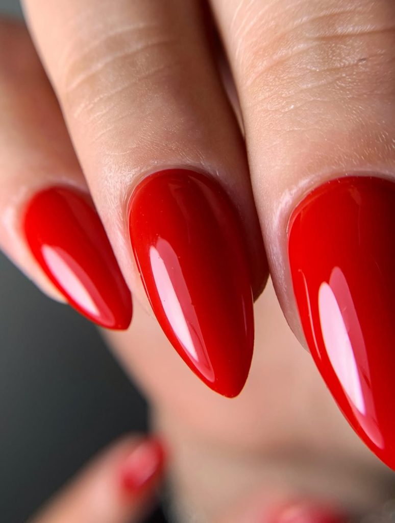 This almond-shaped red manicure leans into bold femininity without excess. The high-shine finish adds depth, while the clean application keeps it refined rather than flashy. It’s proof that solid color nails can still feel fun when shape and finish are done right.