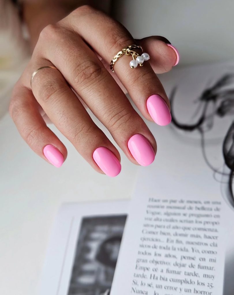 This manicure pairs effortlessly with spring dresses, light knits, and gold accessories. As seen across Pinterest and highlighted, playful pinks are having a major moment, especially when kept clean and solid.