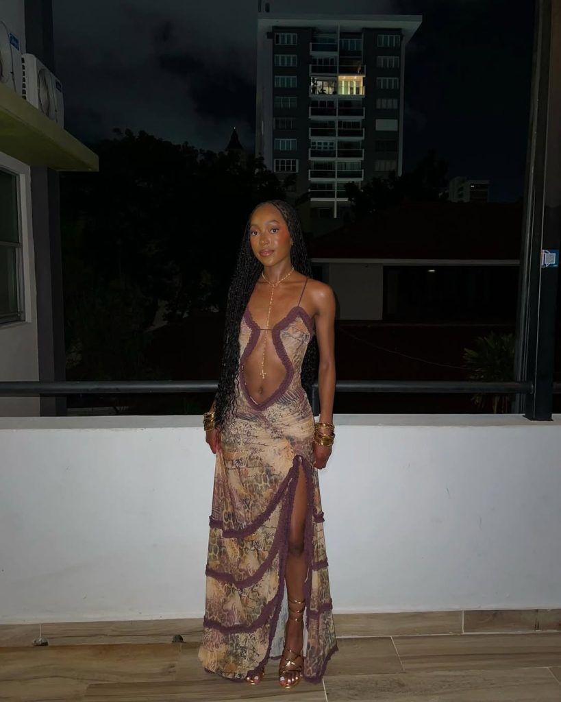 A sheer, earth-toned maxi with lace trims and sky-high slits feels like the glamorous, after-dark side of a tropical escape—mysterious, relaxed, and unforgettable.