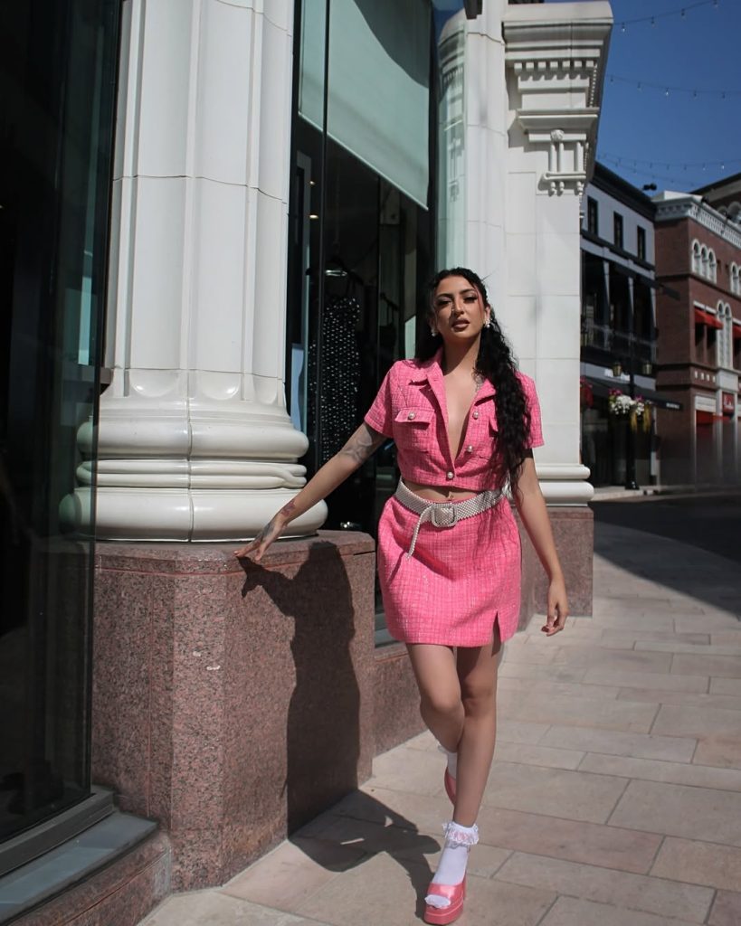 A structured pink tweed mini dress with a deep neckline and belt channels city-Barbie confidence and feels very 2026 birthday chic.
