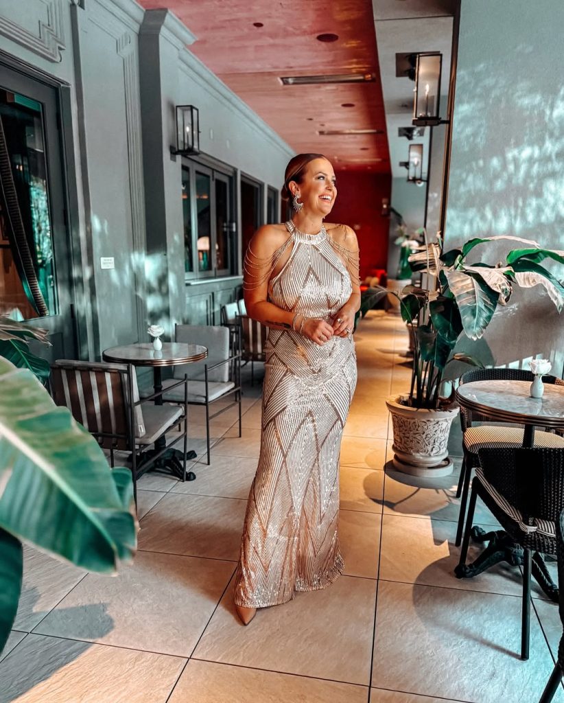 A rose-gold shimmer dress that fits closely to the body and glows under evening lights is a timeless option when you want your birthday look to feel both sultry and sophisticated.
