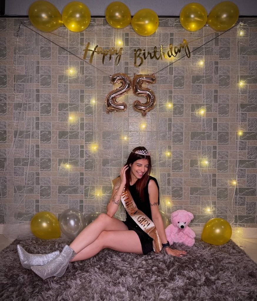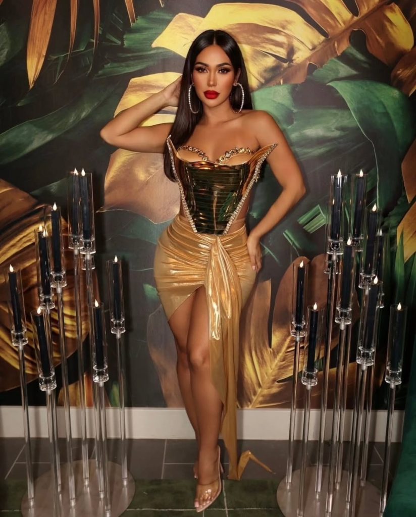 A sculpted metallic corset and draped gold skirt turn a birthday into a full red-carpet entrance, the kind street-style photographers dream about.
