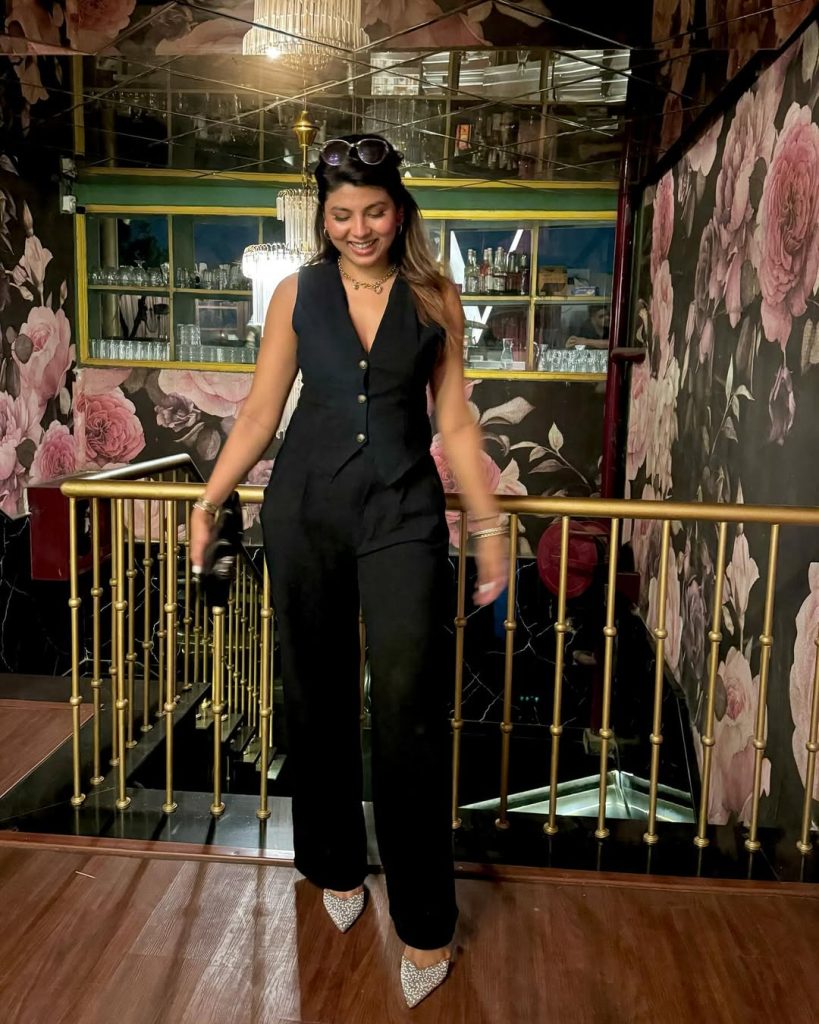 If your ideal birthday plan includes a luxury hotel, martinis, and a late reservation, this black-on-black ensemble is the definition of grown-up polish with a twist.