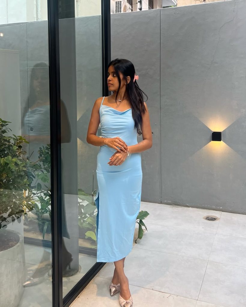 A sky-blue midi slip with delicate straps offers a softer take on birthday dressing, perfect for low-key dinners and gallery dates.