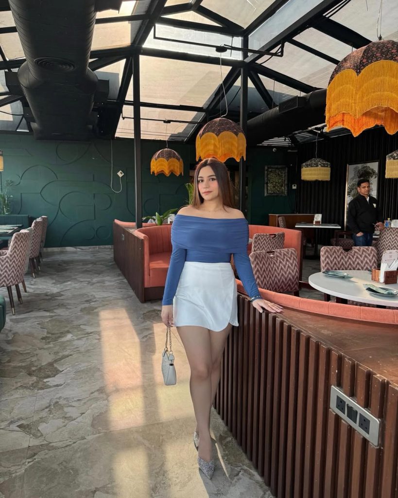 An off-shoulder blue top and white mini skort create a cute, polished look that feels perfect for a birthday brunch or café date.