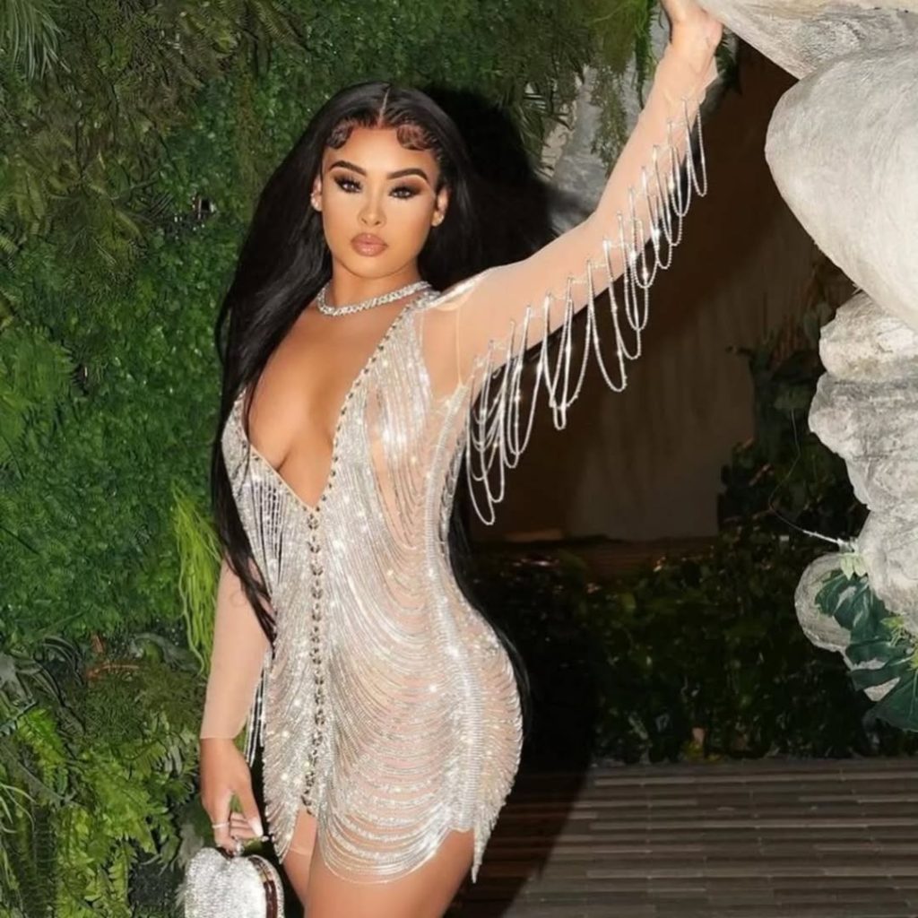 To make a bold entrance at the birthday party, one can wear a crystal fringe mini dress with translucent long sleeves that sparkles with every movement.