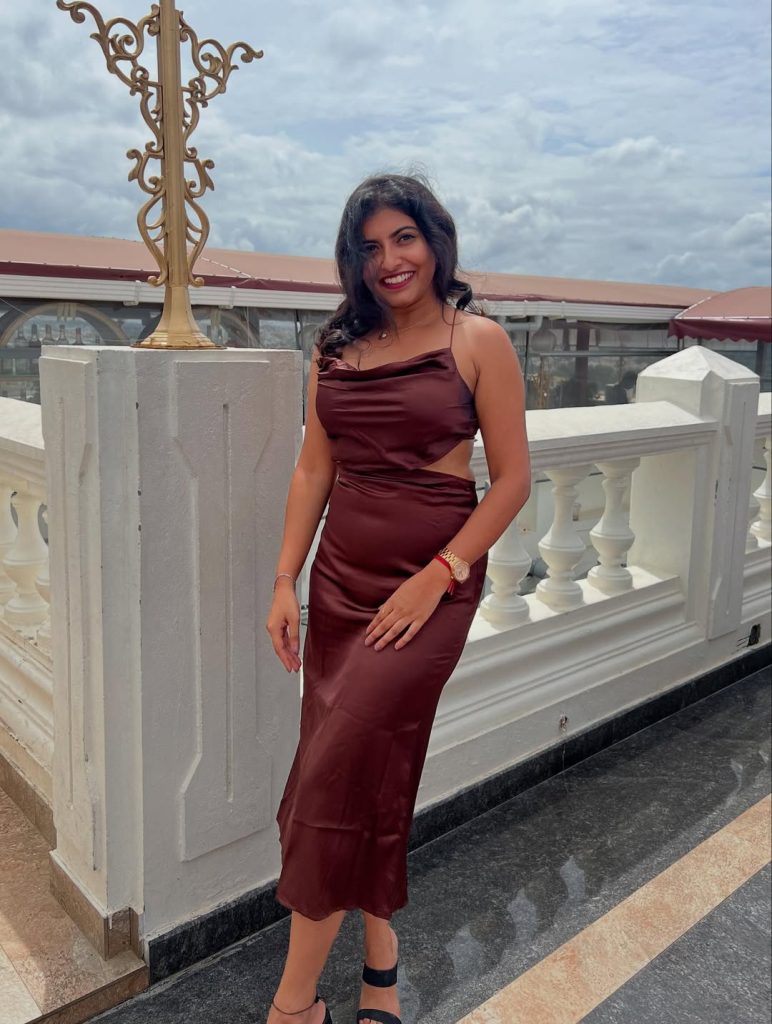 This chocolate-brown-colored satin midi with a side cut-out exudes warm fashion with its presence at day-long parties and at sunset dinners.