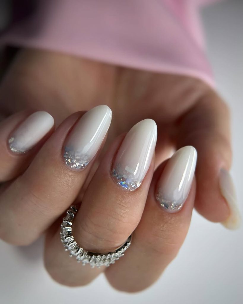 Milky, semi-sheer ivory melts into a barely-there ombré on softly tapered almond nails. At the cuticle, a thin crescent of shattered-glass foil catches the light like a diamond tennis bracelet—a subtle sparkle that still reads “clean.” This is the manicure version of a silk blouse: timeless, breathable, and instantly classy.