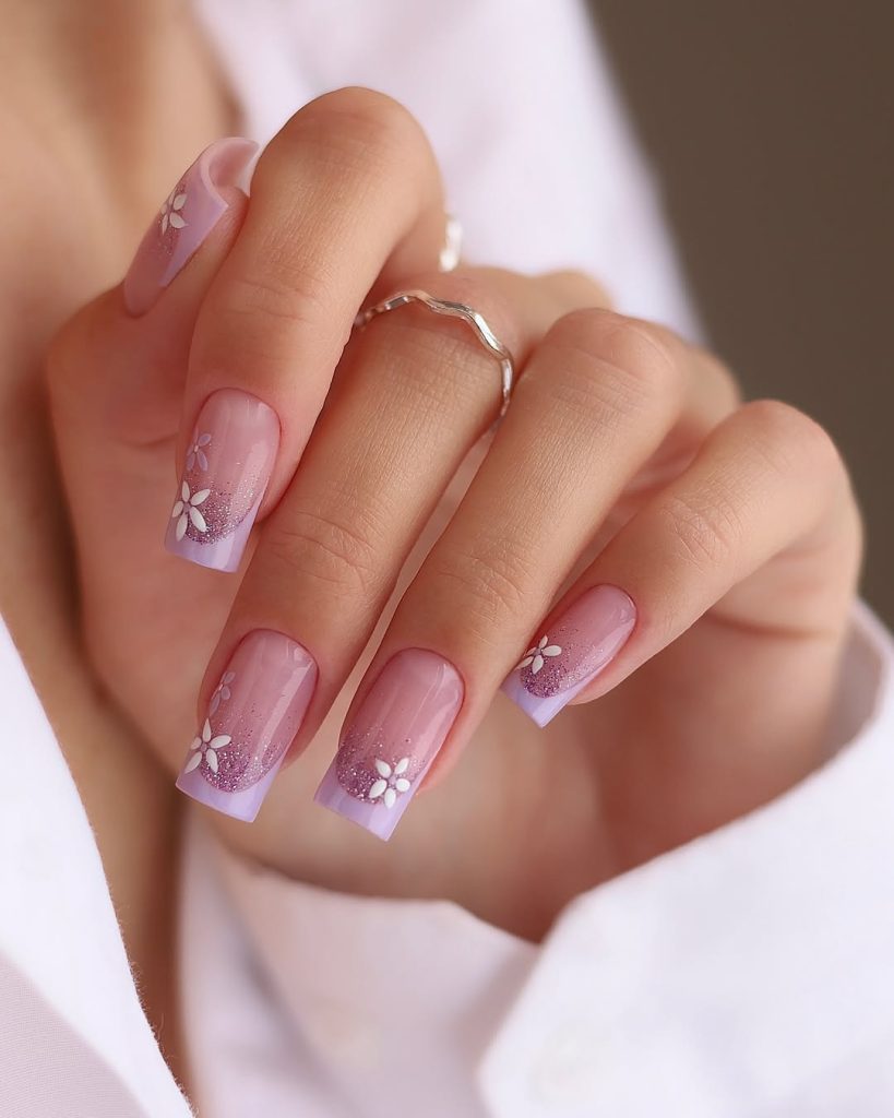 A soft lilac tip sweeps across glossy nude on crisp square nails, dusted with fine sparkle and petite white florals. It’s playful without skewing teen—think Napa brunch, not school dance.